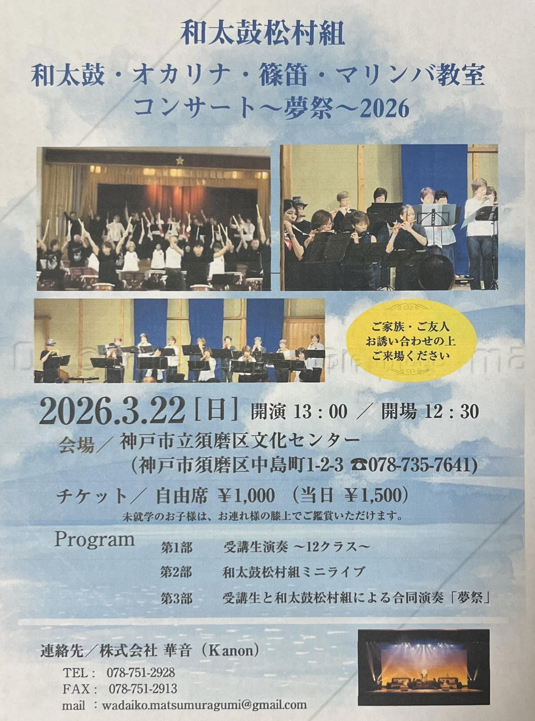 2026.3.22(日)「和太鼓松村組 和太鼓・オカリナ・篠笛・マリンバ教室コンサート"夢祭"」